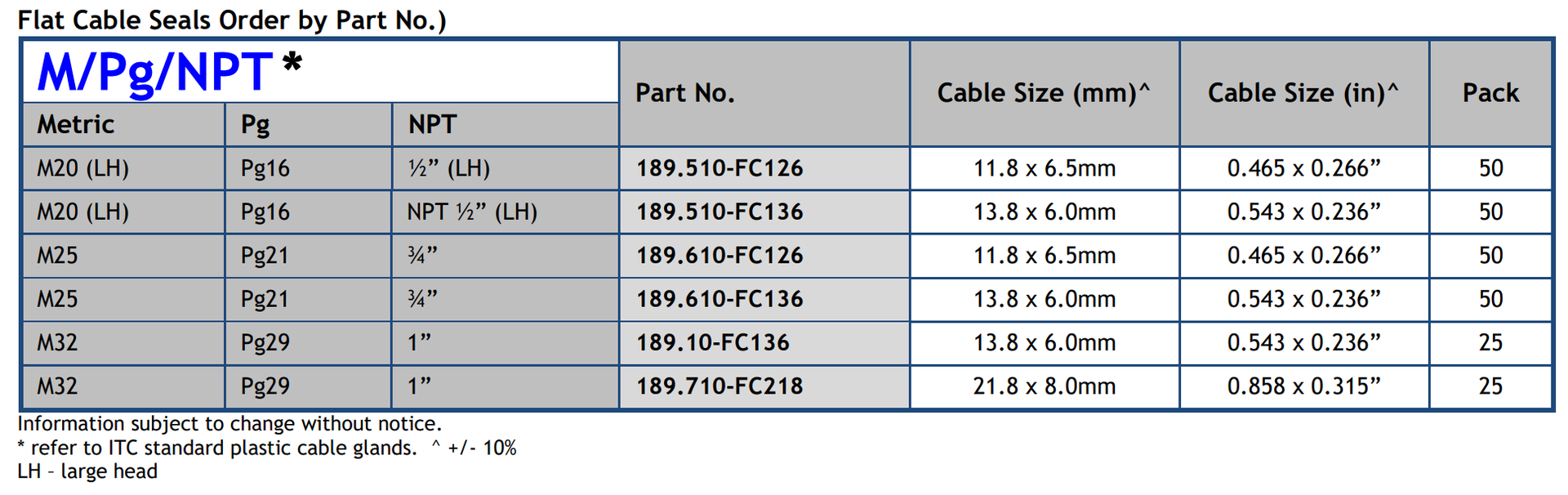 The flat cable seals are designed to be inserted in place of the original seals of ITC plastic cable glands.